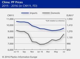 China Standard Thermoplastics July 2016: Ethylene and styrene import quotes drop / Propylene firm / Demand satisfactory / Aside from PE and PET, all grades point up / Imported polymer notations also rise / Little change expected in August